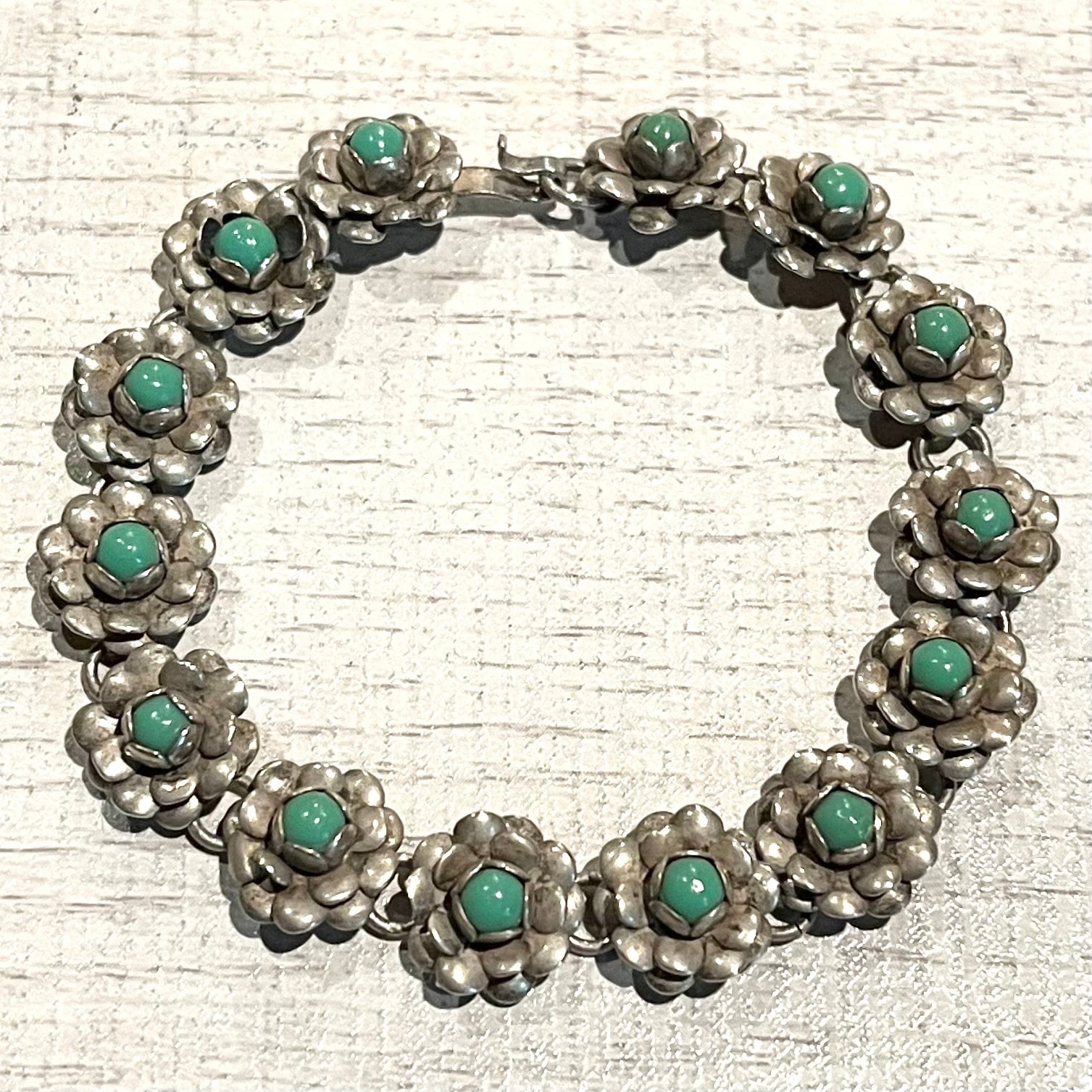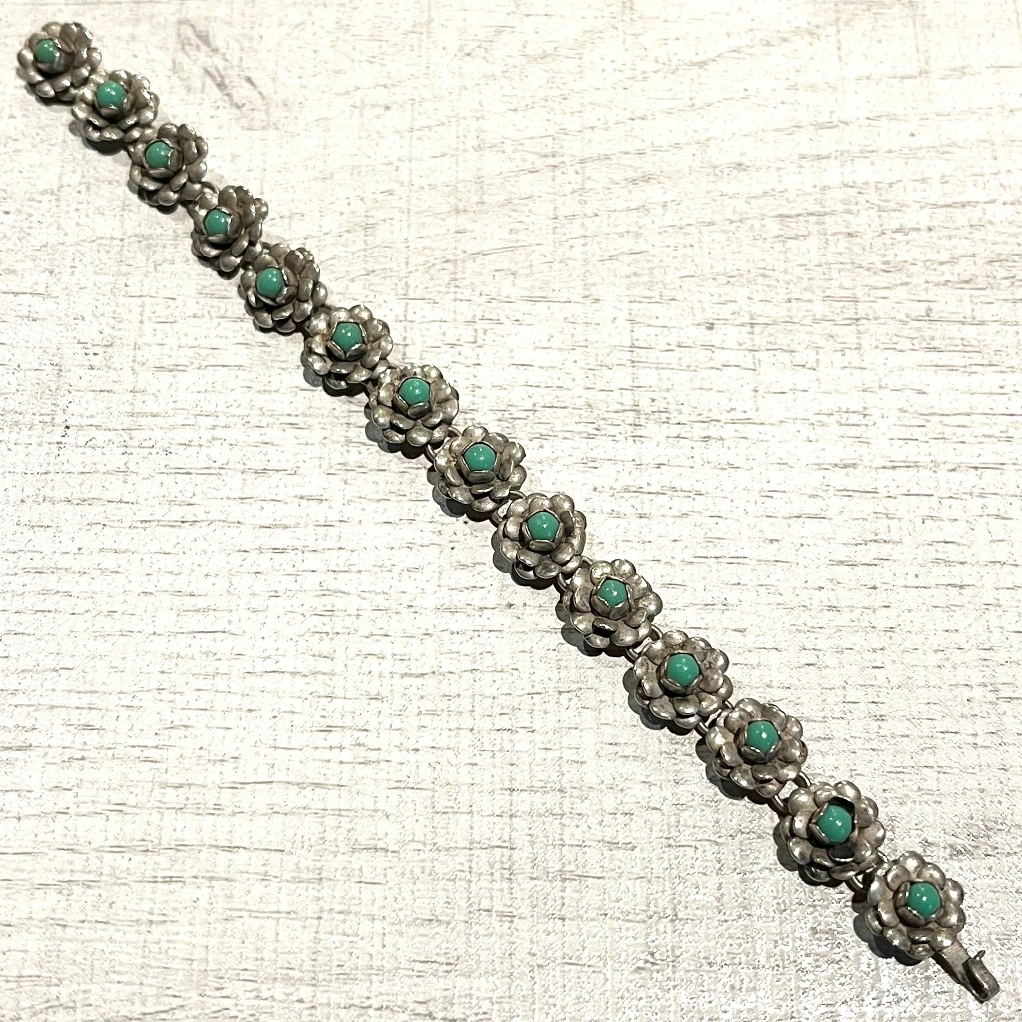 鮮やかなターコイズグリーンを配した、華やかなフラワーデザインのブレスレットです。程よい褪色感が雰囲気抜群の逸品です。