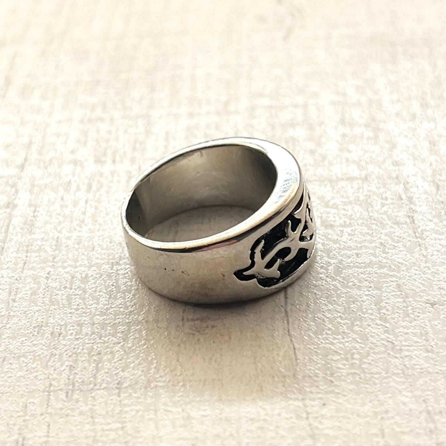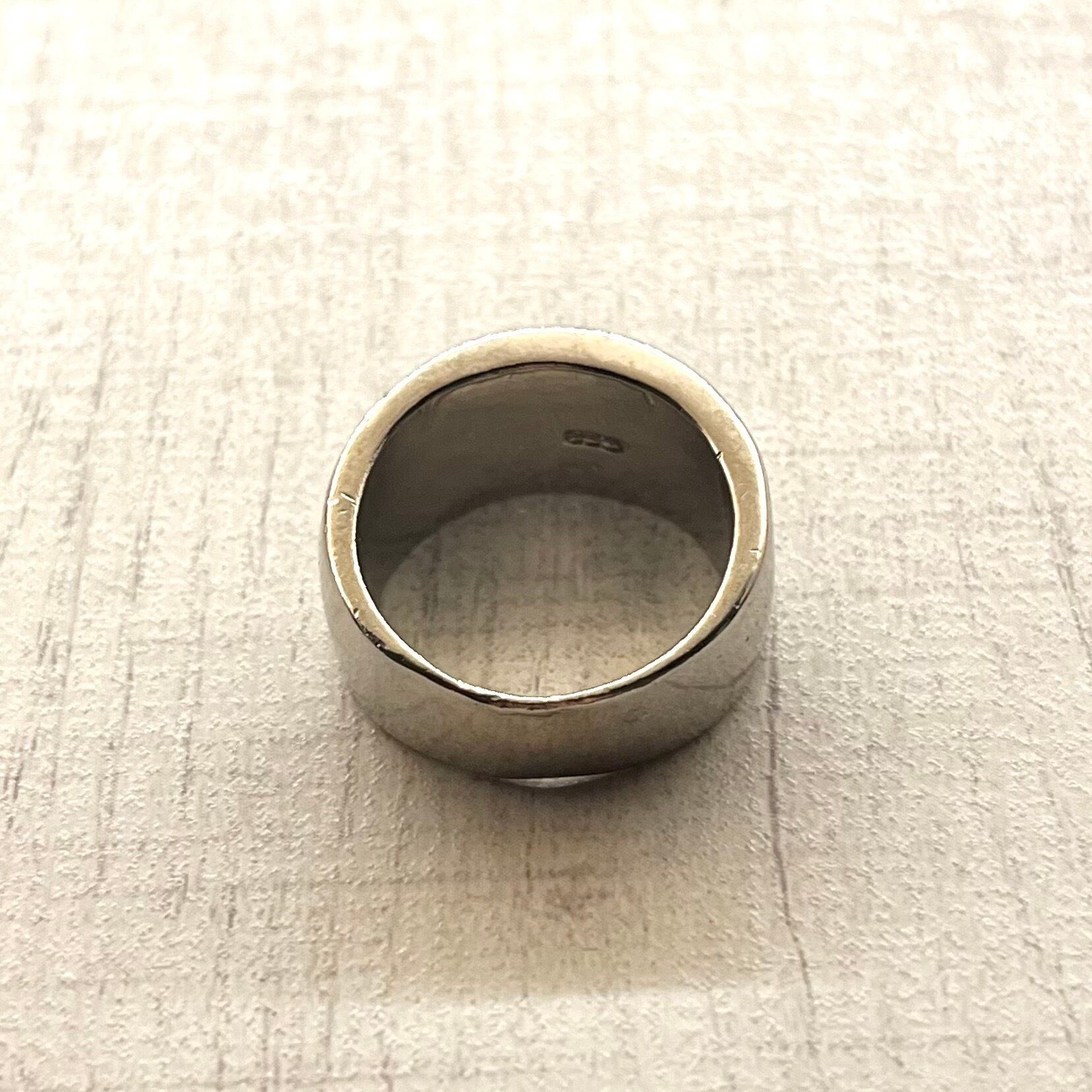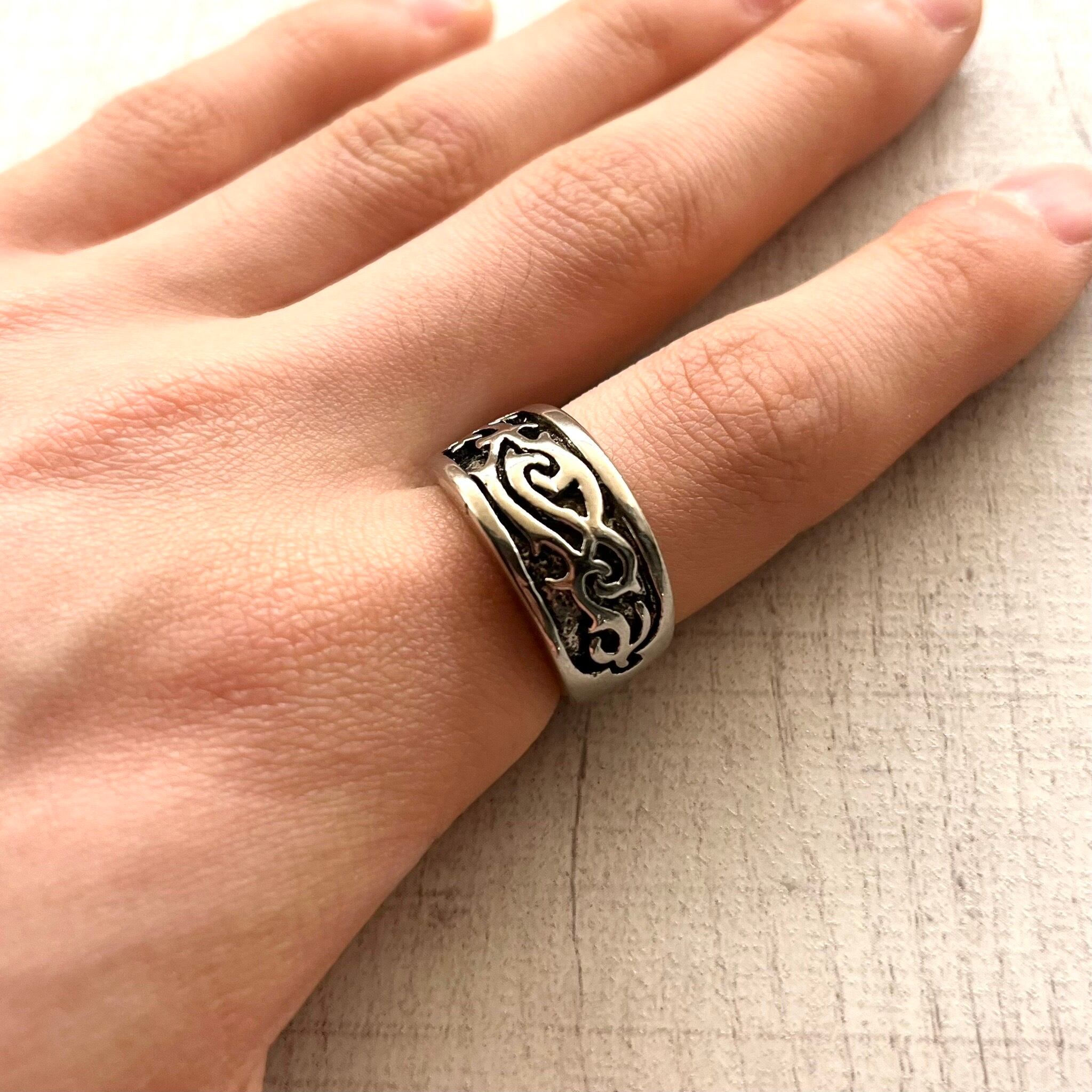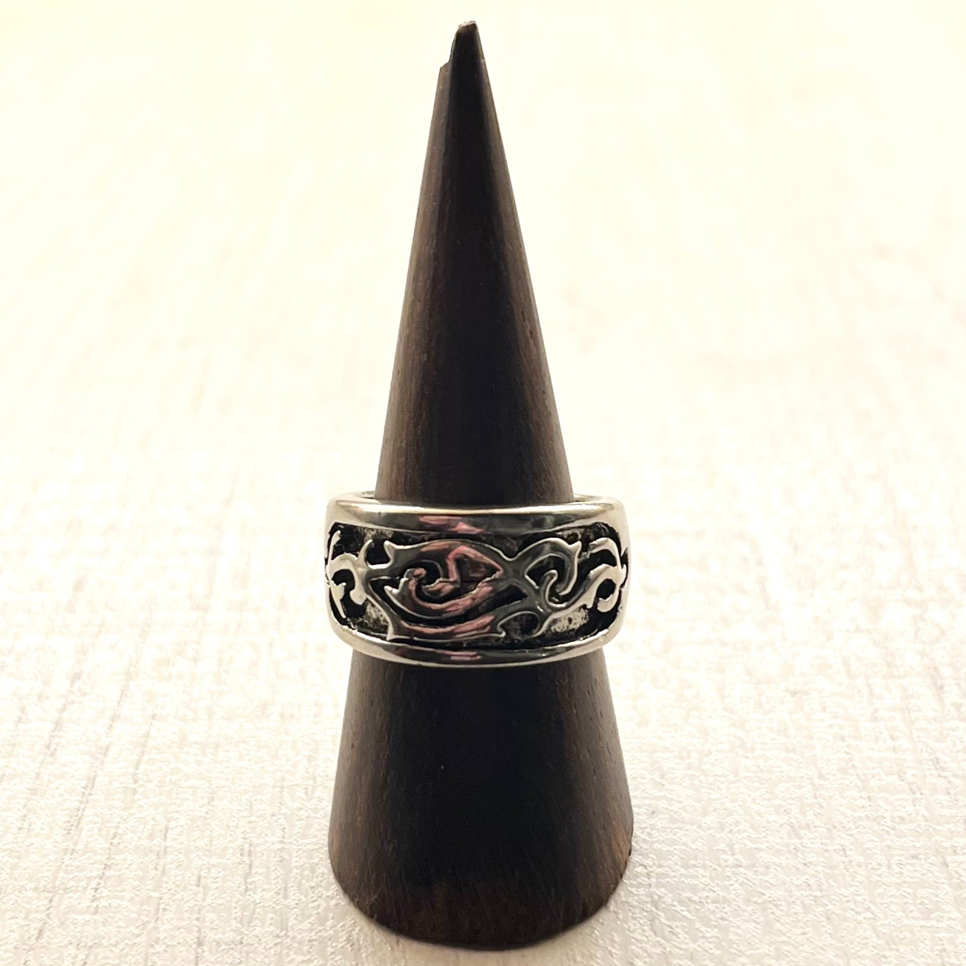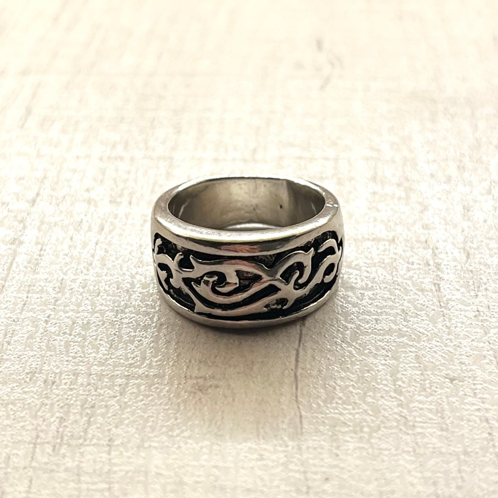 唐草模様が施された、インパクトのあるリングです。シルバー特有の、滑らかで深みのある輝きが、雰囲気抜群の逸品です。