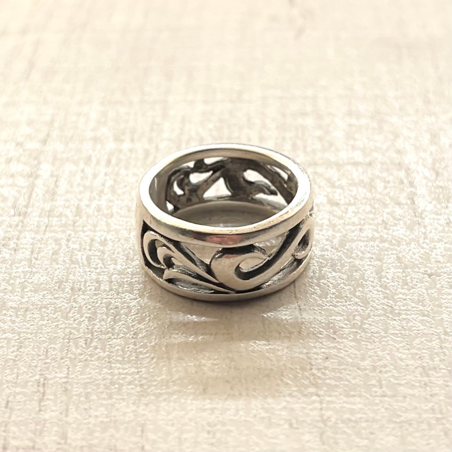 抜け感のあるオープンワークに、アラベスク模様が施された華やかなリングです。程よいボリューム感があり、存在感抜群の逸品です。