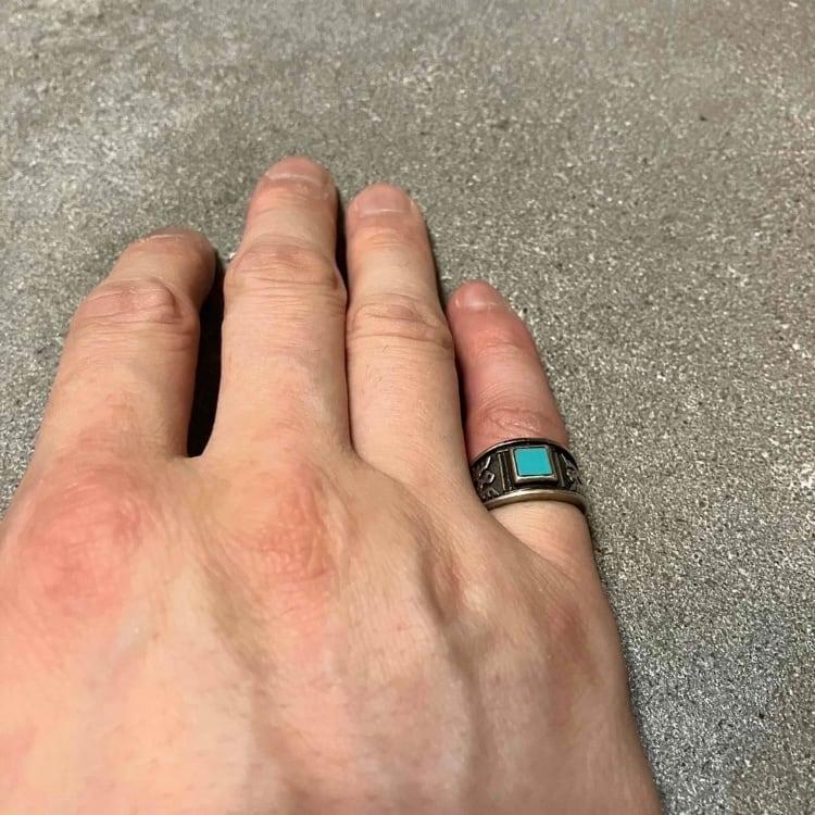 インディアンデザインのジュエリーにターコイズを配置したインパクトのあるリングです。