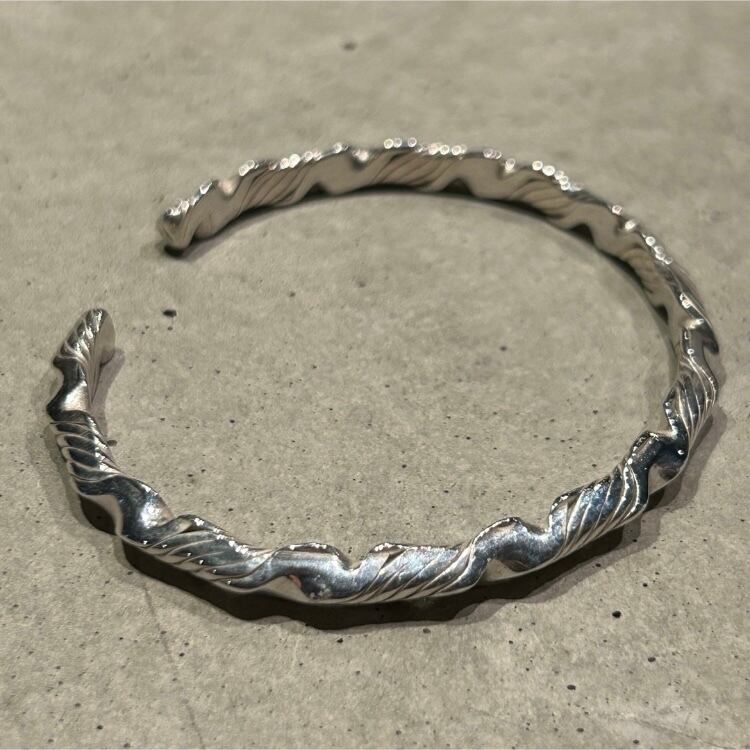 全体的に彫り込みデザインが施されたツイストバングルです。