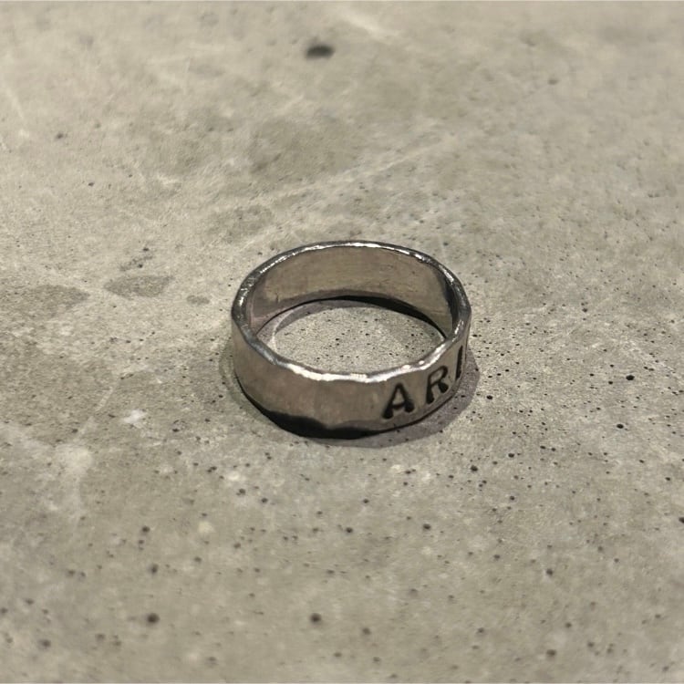 ARIGATOとローマ字で彫られた槌目デザインリングになります。