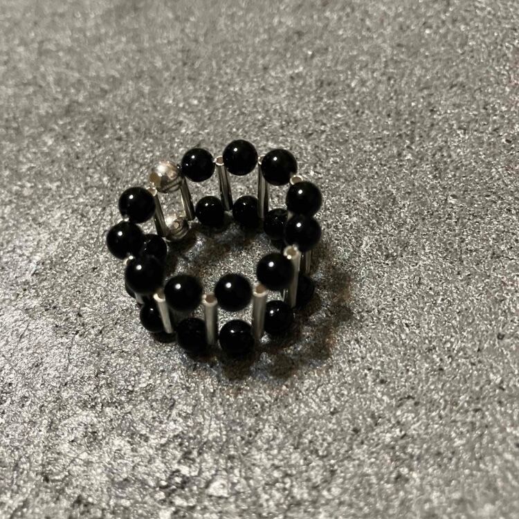 伸縮性があり、シルバーパーツを使用した珍しいデザインのリングです。