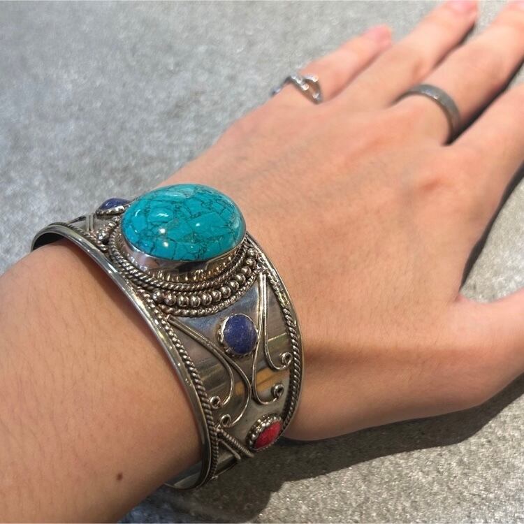 かなりワイドなターコイズ×コーラルのシルバーバングルです。