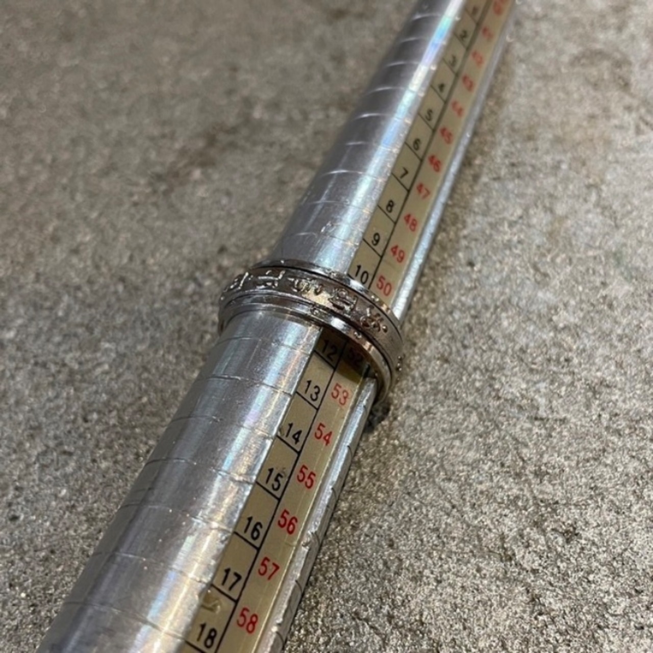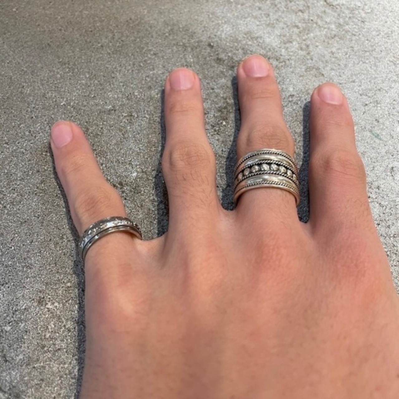 文字のデザインのついた部分とリング本体が別のパーツになっており、回転するようになっている遊び心のあるリングです。