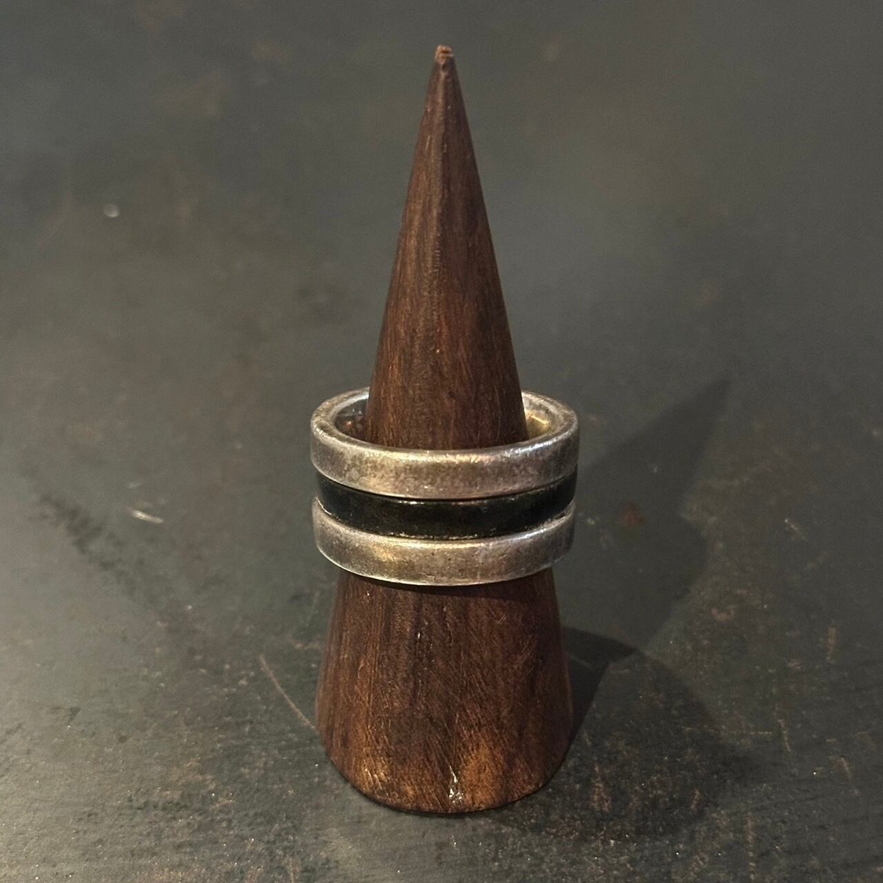 海外で買い付けた黒のラインが入ったデザインのシルバーリングです。