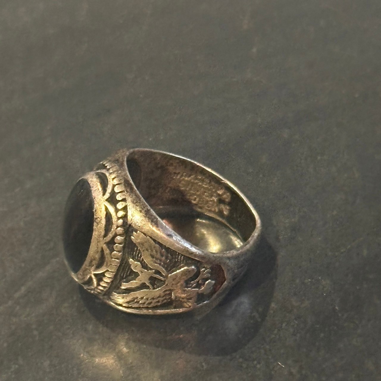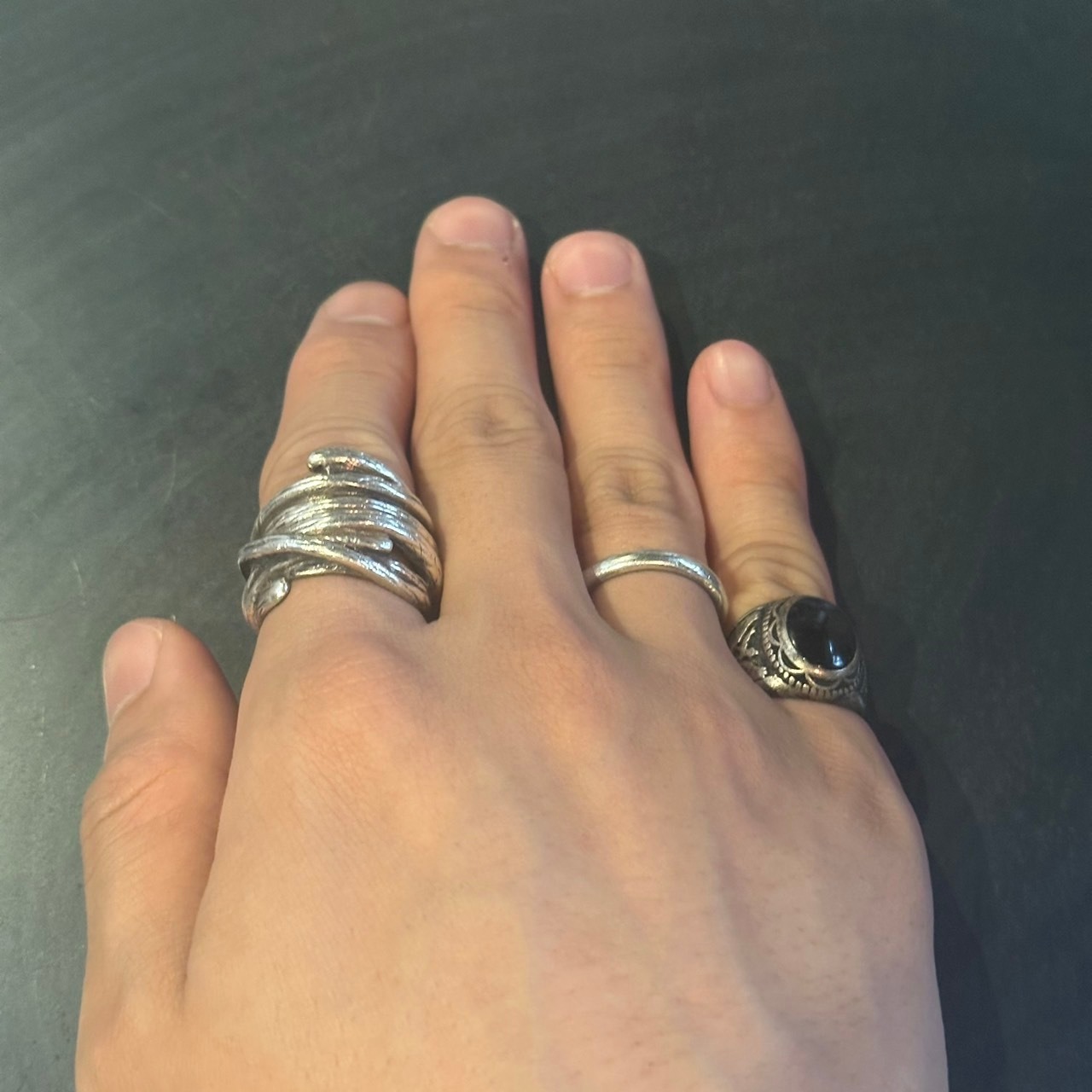 海外で買い付けたオニキスデザインのシルバーリングです。