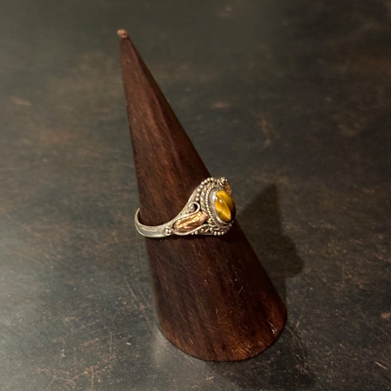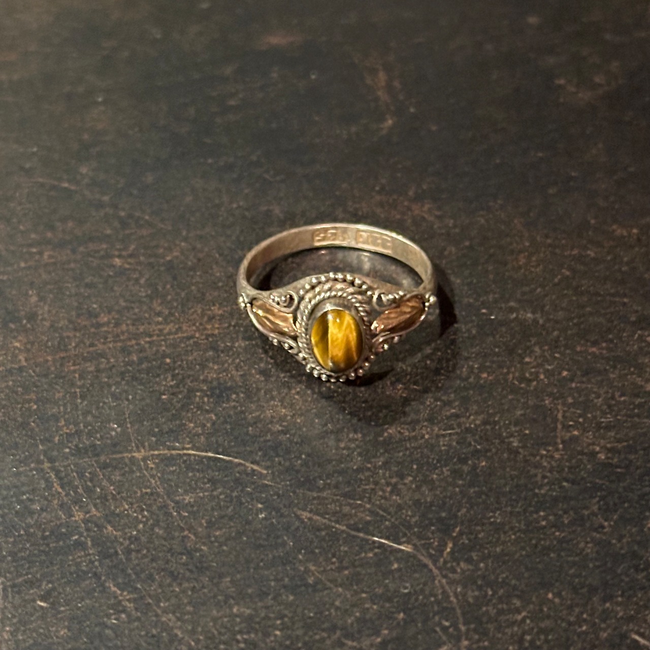 海外で買い付けたタイガーアイデザインのシルバーリングです。