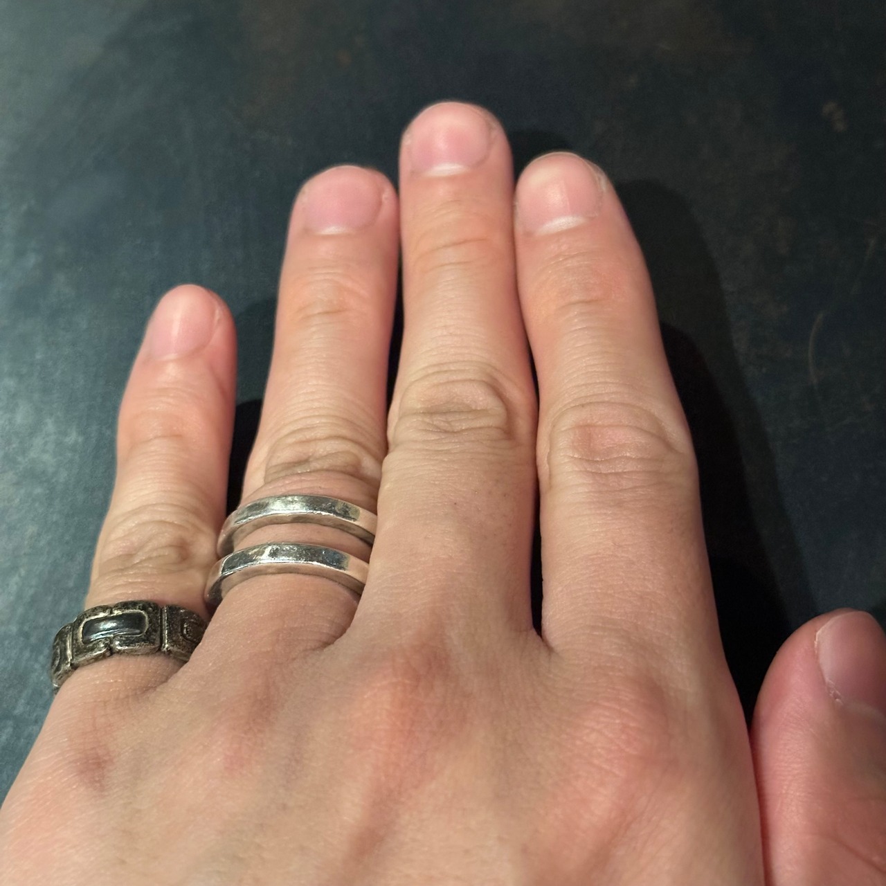 海外で買い付けたCカッティングデザインのシルバーリングです。