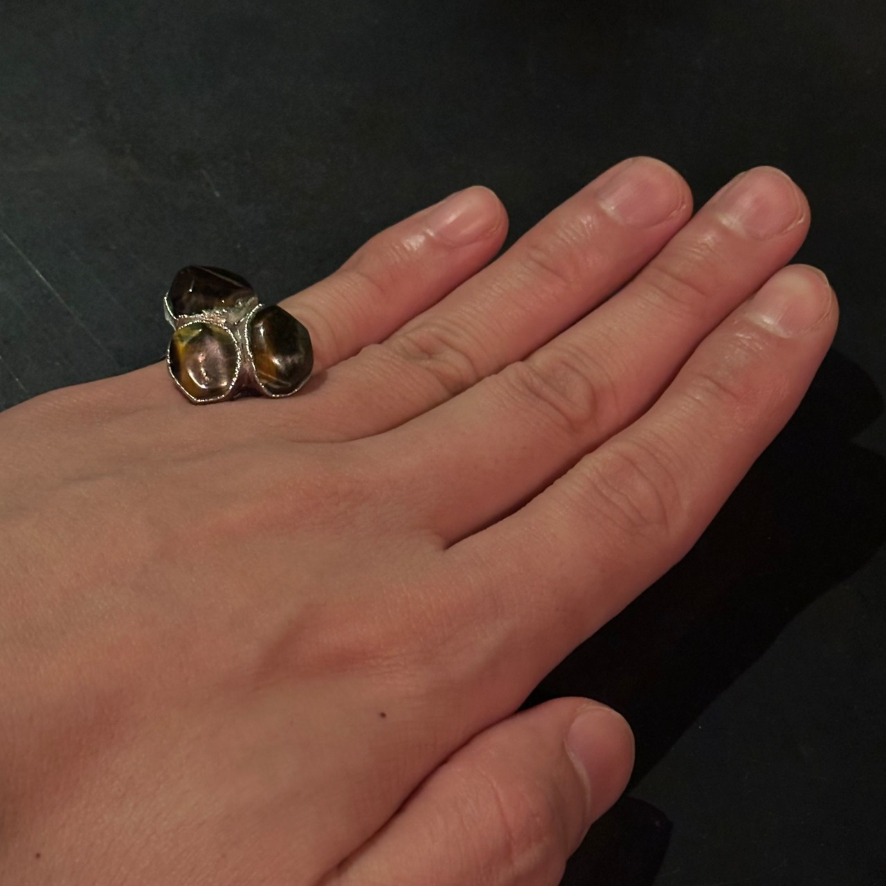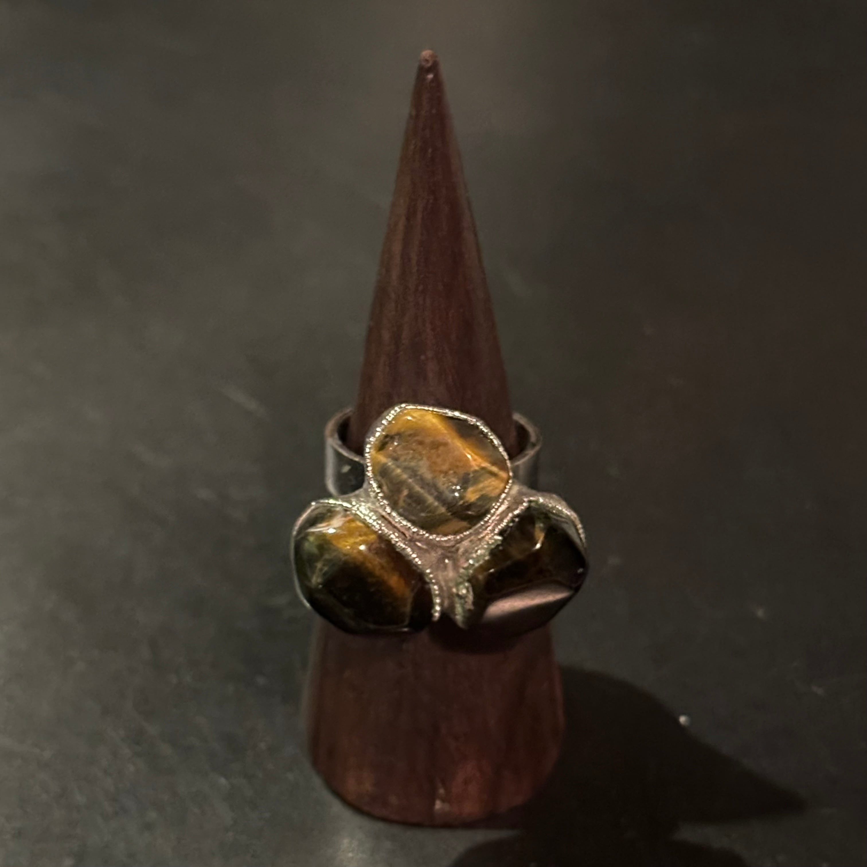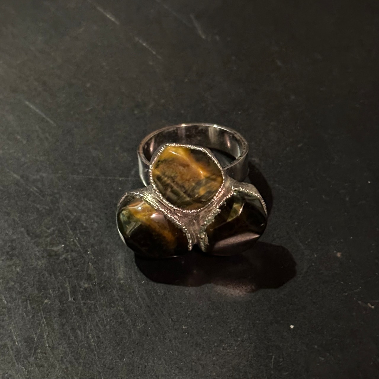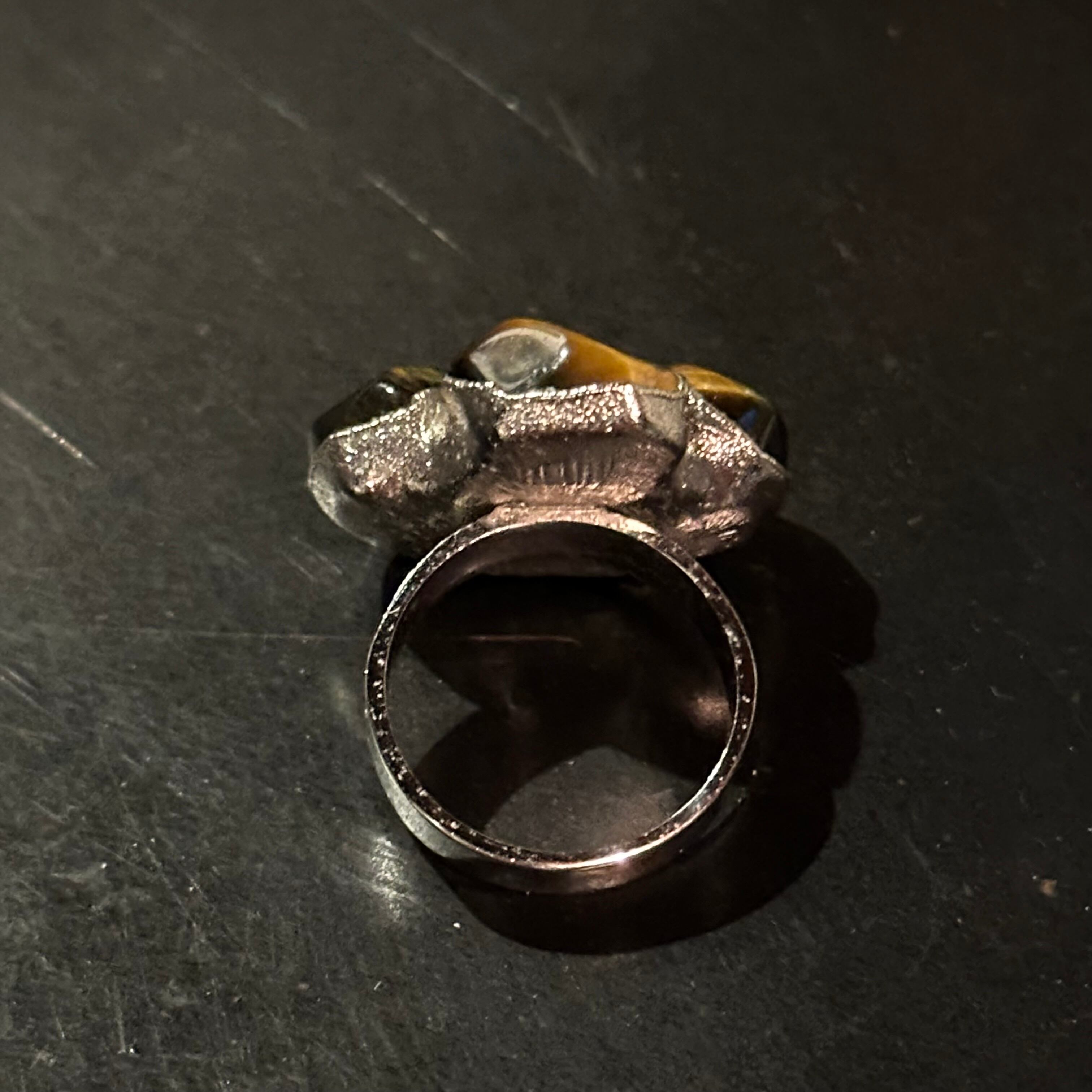 海外で買い付けたタイガーアイデザインのシルバーリングです。