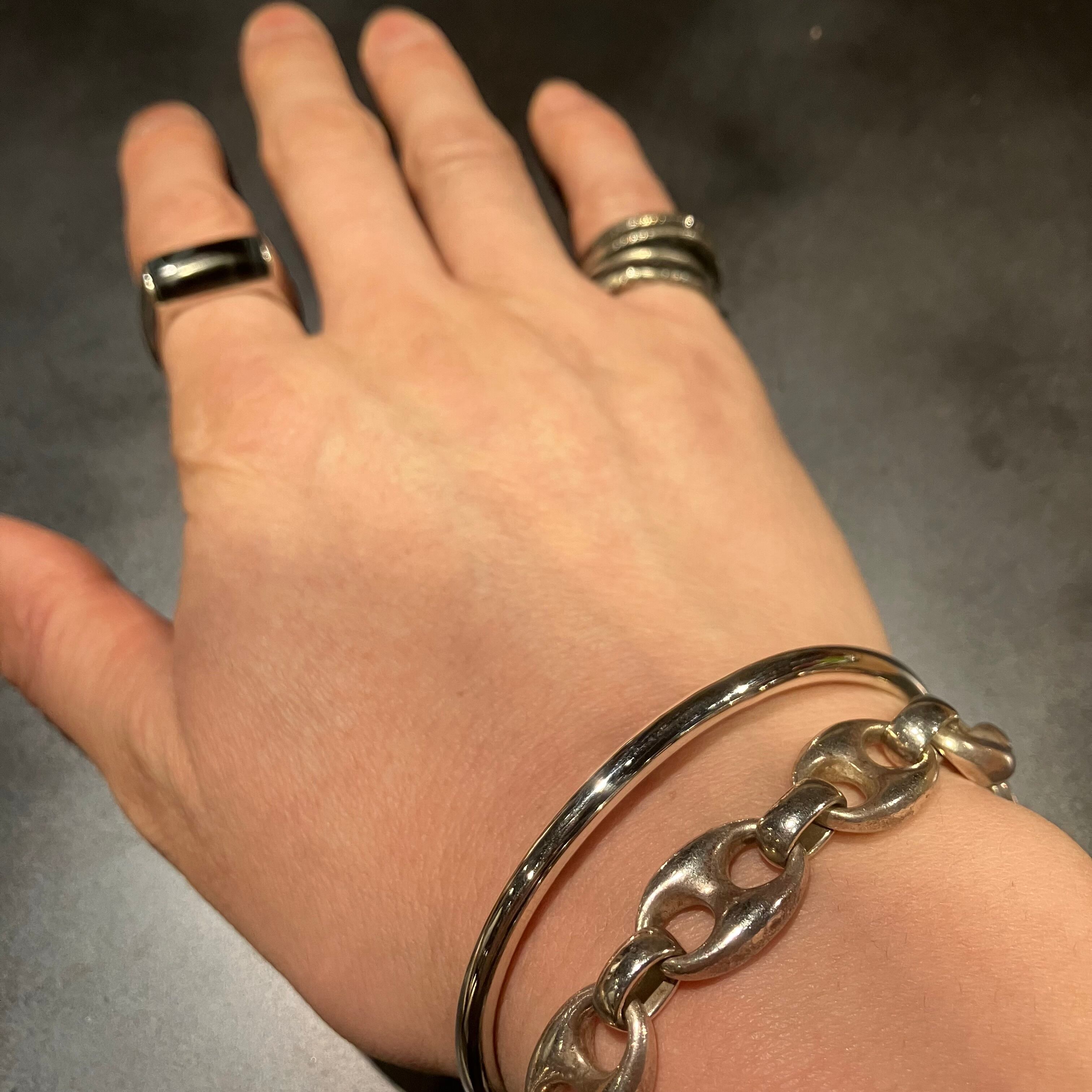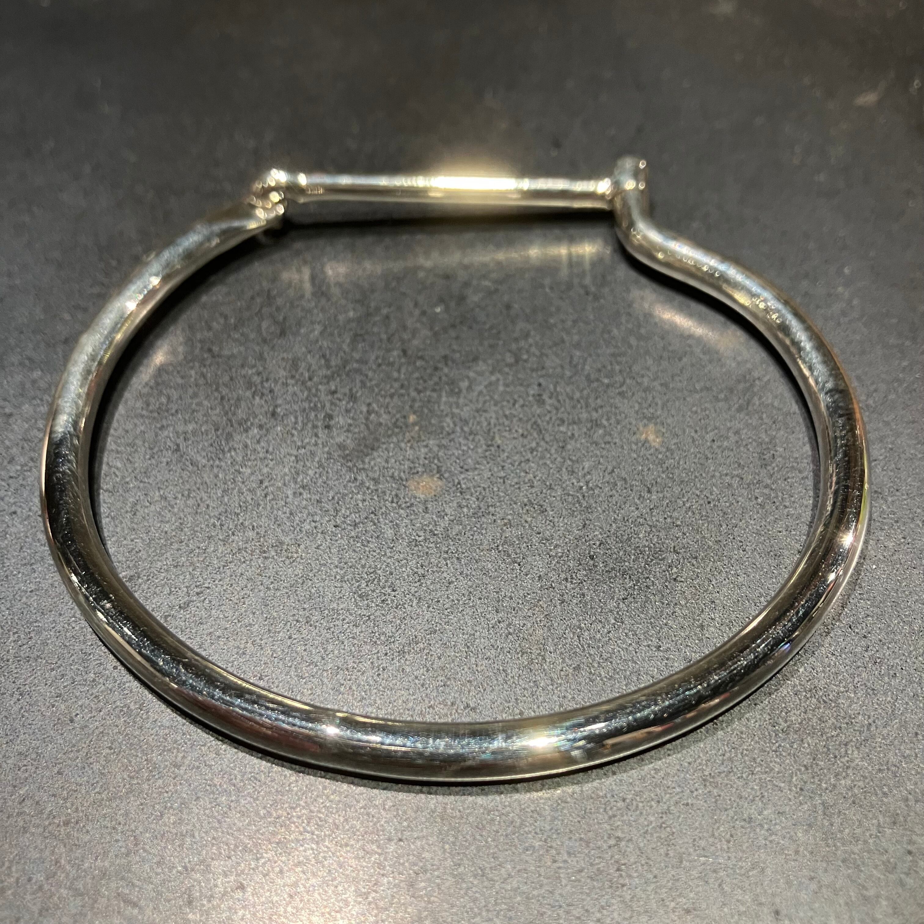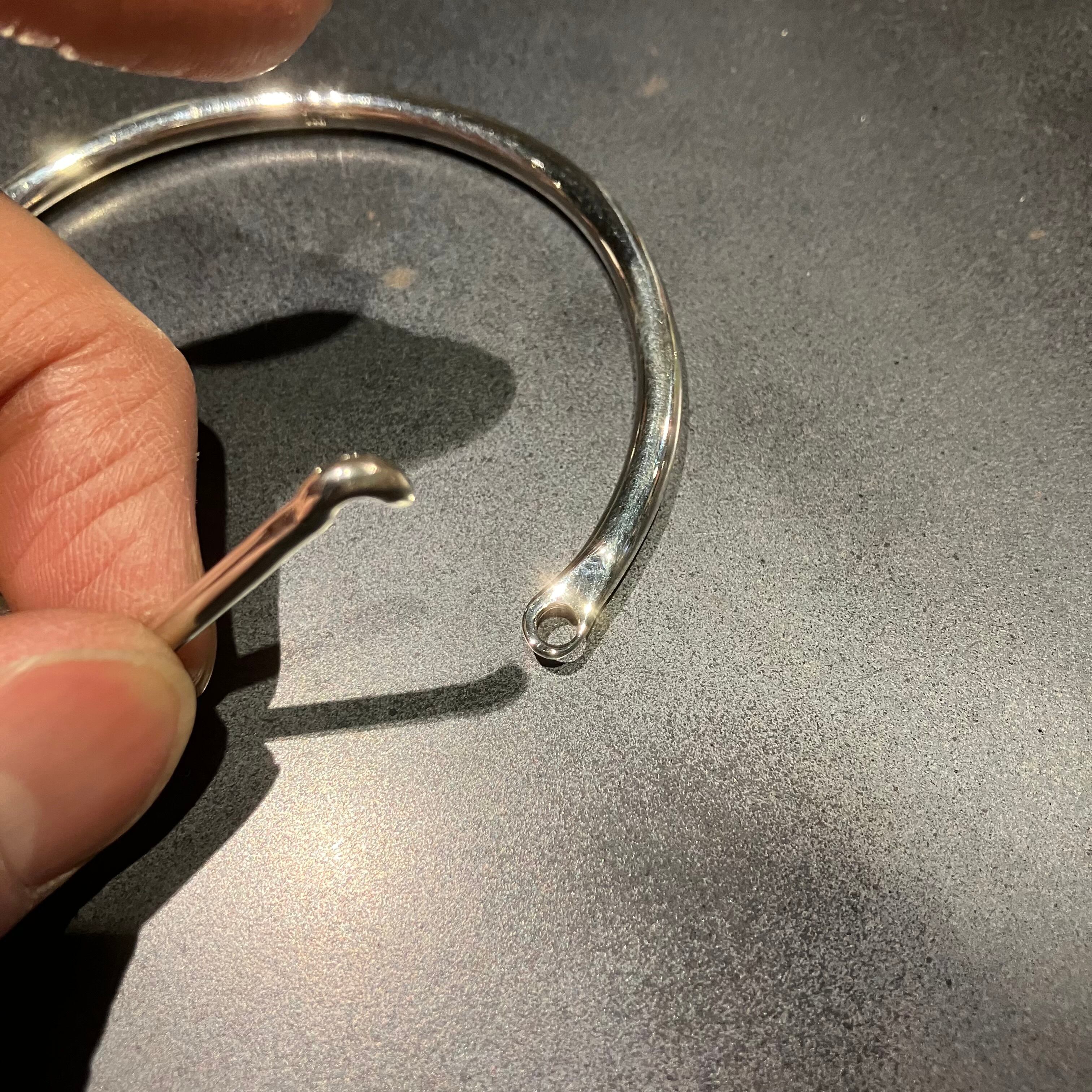 フックに引っかけて装着する珍しいタイプのバングルです。