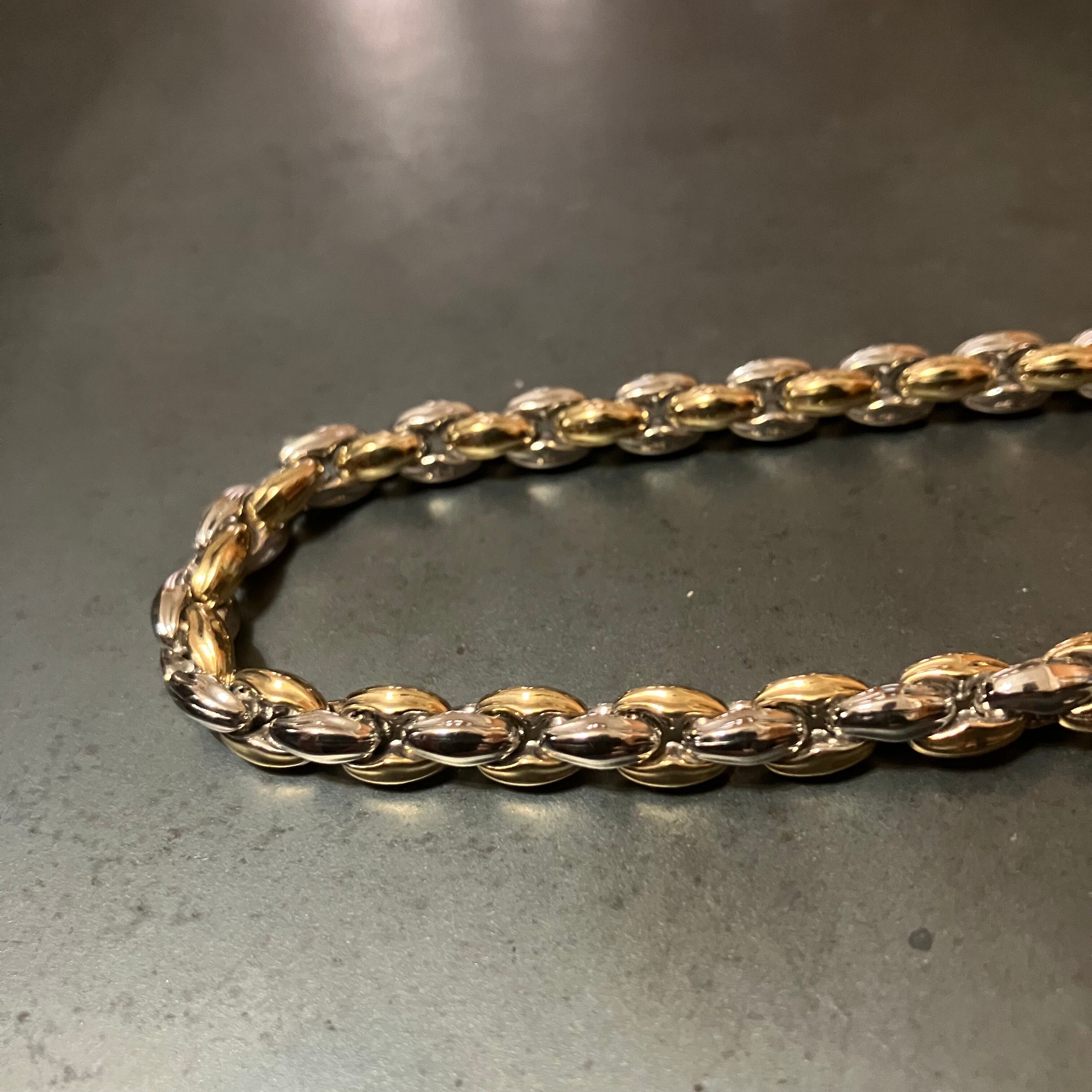 ゴールドとシルバーの色味の違った2つのチェーンを組み合わせております。