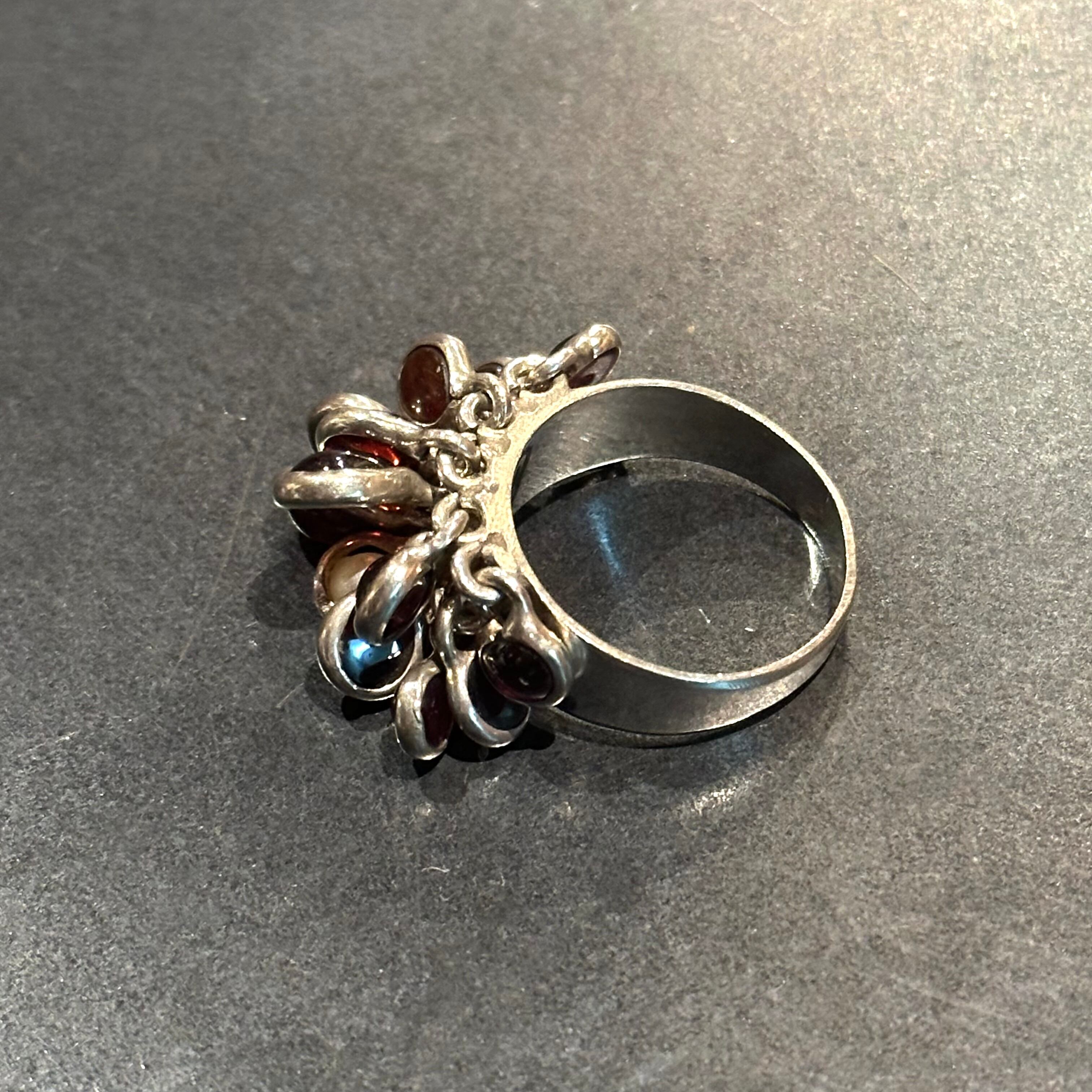 海外で買い付けたパーツが多数付いているデザインのシルバーリングです。